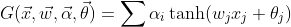 To relate the graph with the equation, x_j are the input, w_j are the weighting on the first layer, theta_j is the weighting on bias, and alpha_i are the weighting on the second layer. The equation only describes single output; just add another subscript k to turn the equation into multiple output.